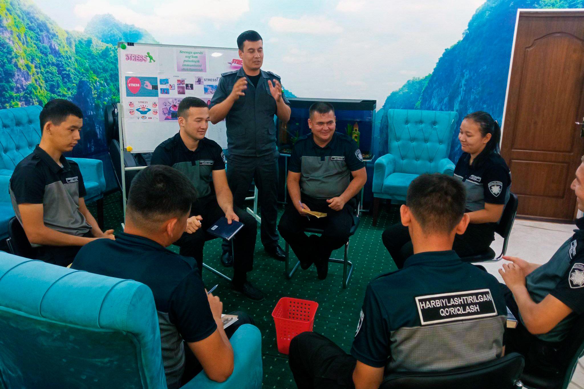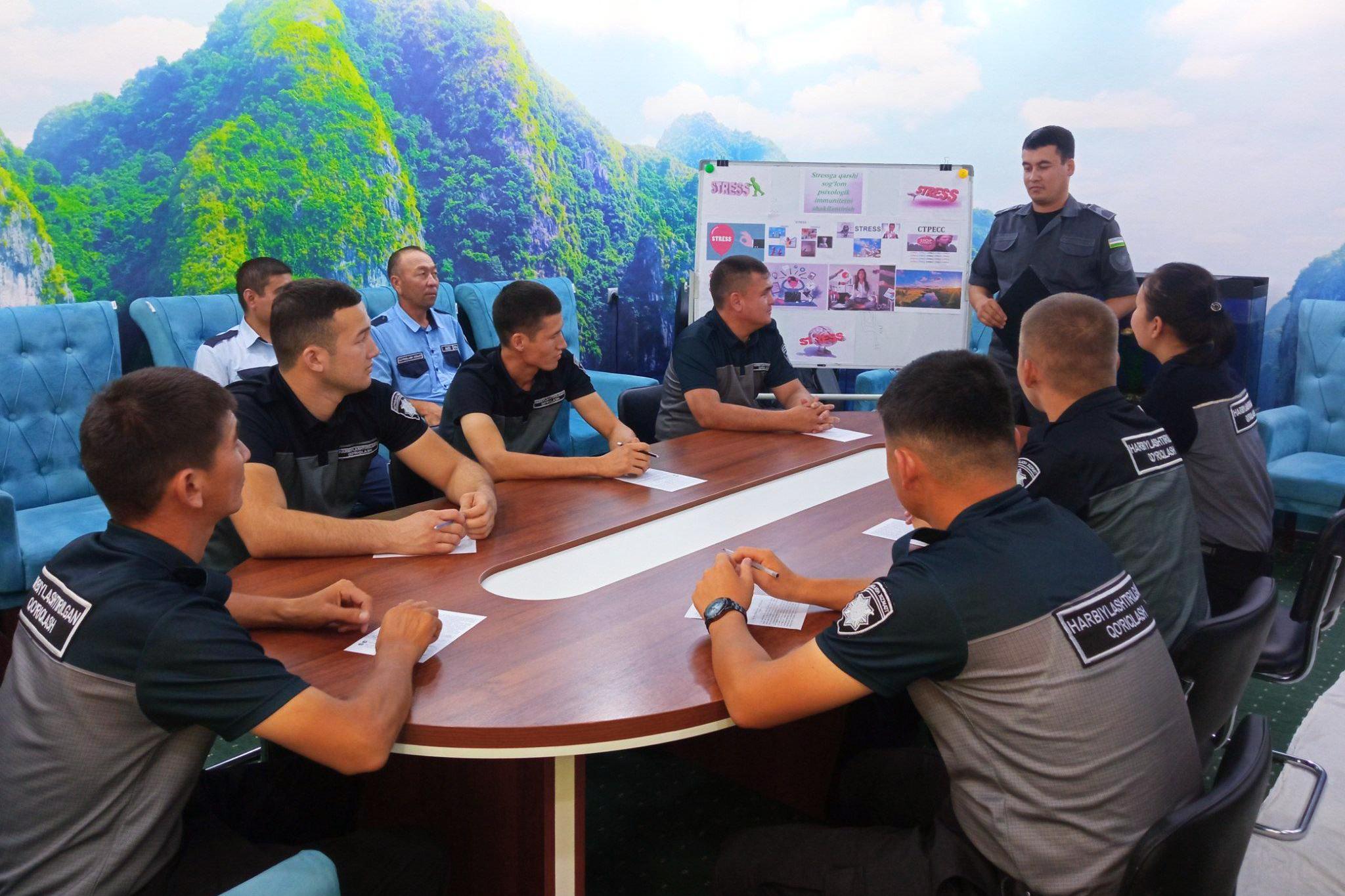 Бундан ташқари, Қорақалпоғистон Республикаси Қўриқлаш бошқармасининг психолог ходимлари томонидан ҳам шахсий таркиб орасида стресс ҳолатининг олдини олиш ва уларнинг хизматга бўлган муносабатини янада ошириш мақсадида "Стрессга қарши соғлом психологик иммунитетни шакллантириш" мавзусида тренинг машғулотлари ўтказилди.