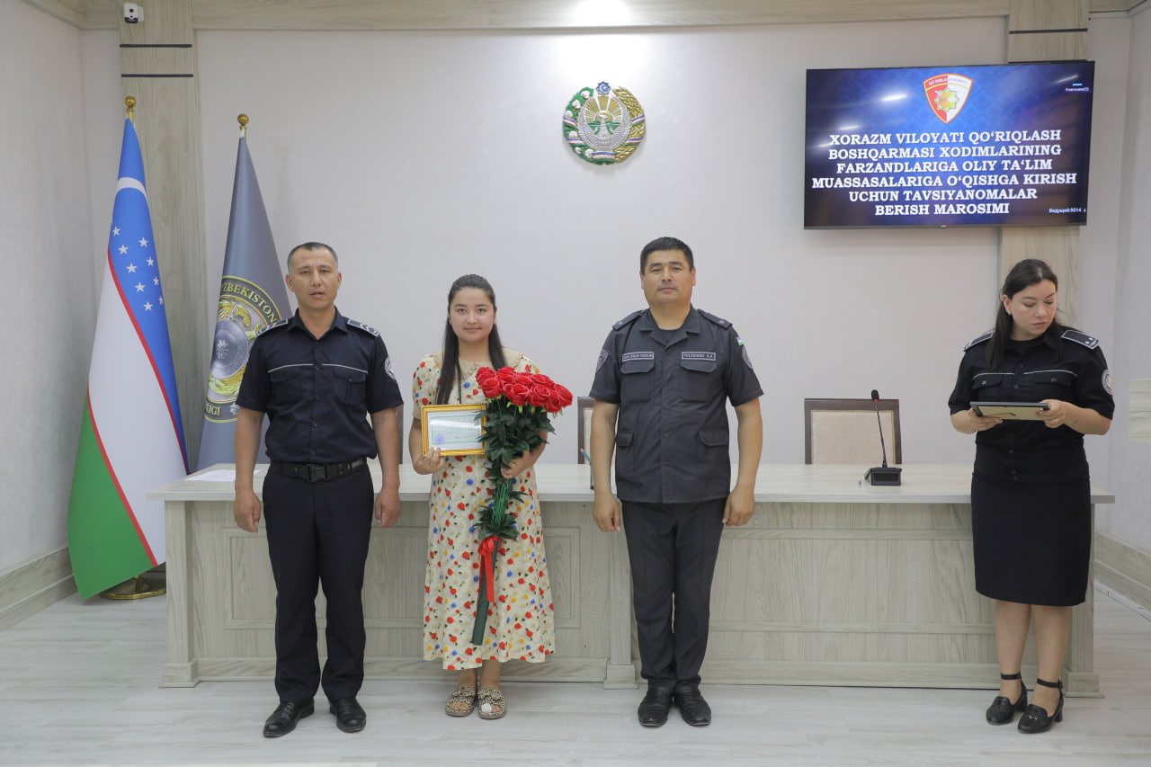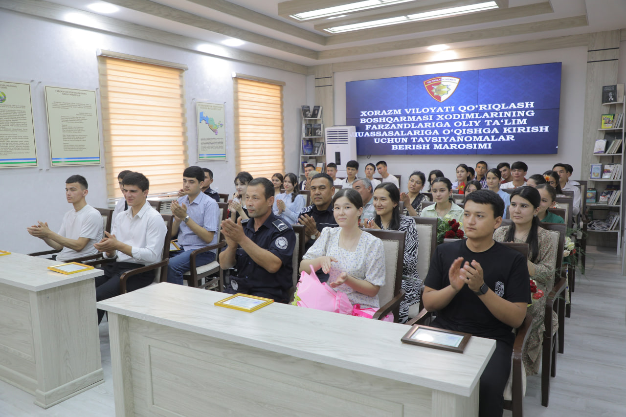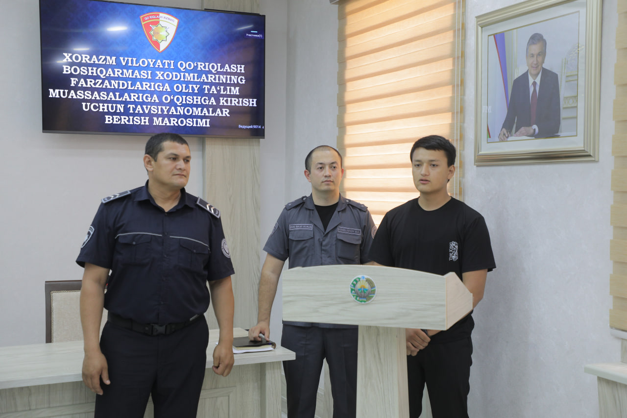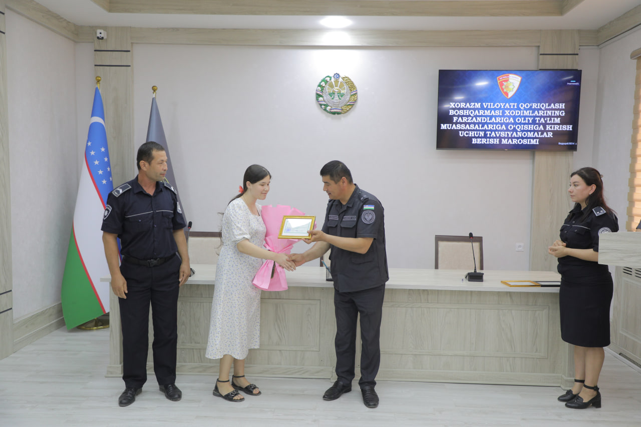 Хоразм вилояти Қўриқлаш бошқармасида кўп йиллар давомида сидқидилдан хизмат қилиб, ўз фидойилиги, масъулияти ва юксак интизоми билан ҳамкасбларига ўрнак бўлган бир гуруҳ соҳа ходимларининг фарзандлари олий таълим муассасаларига кириш учун навбатдаги тавсияномаларни қабул қилиб олишди.
