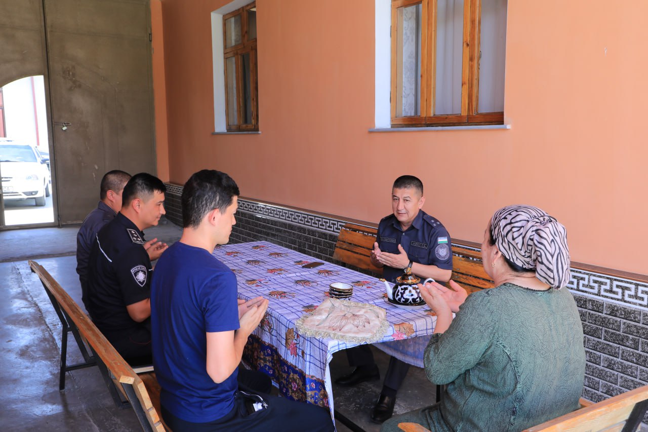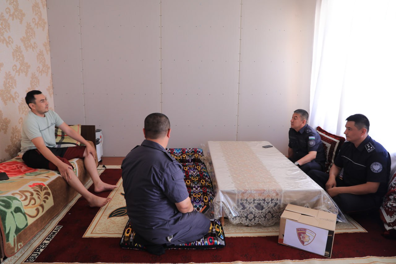 Жиззах вилояти Қўриқлаш бошқармаси раҳбарияти томонидан ходимларнинг оилавий шароитини ўрганиш, ижтимоий ҳимояга муҳтож, соғлиғида муаммоси бор ходимларнинг оиласига кўмак кўрсатиш мақсадида ходимларнинг хонадонларида бўлиб уларнинг ота-оналари билан дилдан суҳбат қурдилар