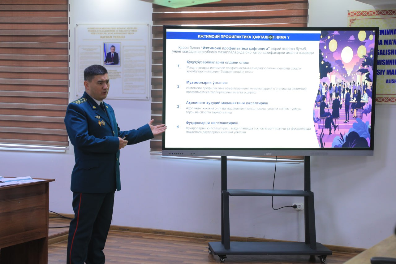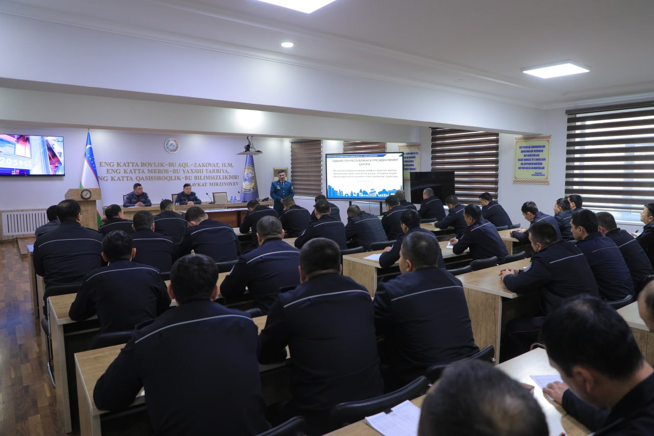 The event brought together officers from the Public Security Department of the Ministry of Internal Affairs, representatives of the Advanced Training Institute, staff members of the Security Service apparatus, and operational personnel. Participants engaged in a thorough discussion of the decree’s essence and significance, as well as the priority tasks assigned to relevant agencies for its implementation. Special attention was given to the programme of targeted measures for establishing a safe environment in mahallas and to ways of enhancing the effectiveness of the early crime prevention system.