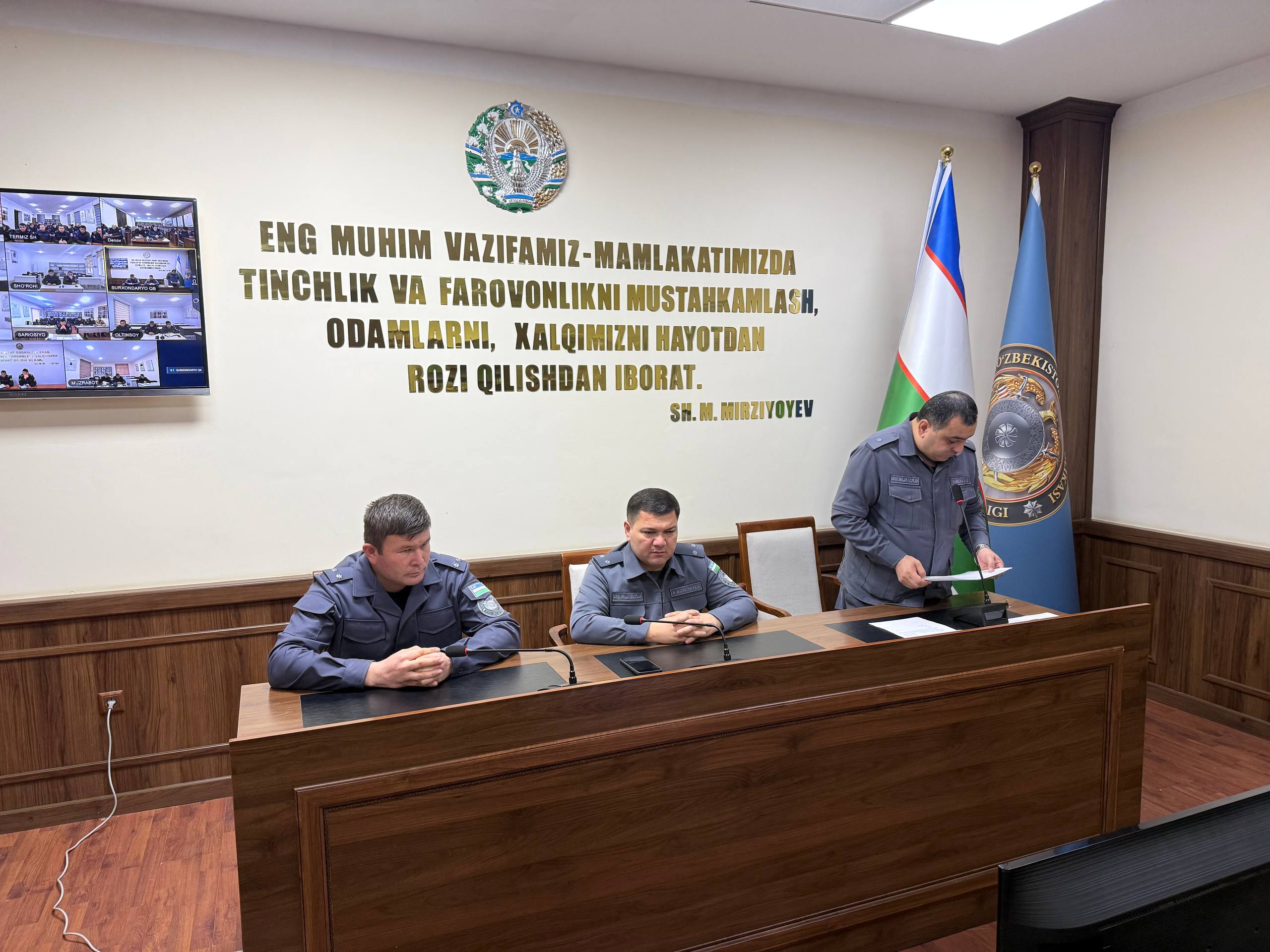 A regular meeting was held in Protection Service of Surkhandarya region under the leadership of the head, Lieutenant Colonel A. Choriyev. During the meeting, the key issues of the unitʼs activities were discussed. Special attention is paid to the observance of official discipline, ensuring security at protected facilities and increasing the responsibility of employees in the performance of official duties.