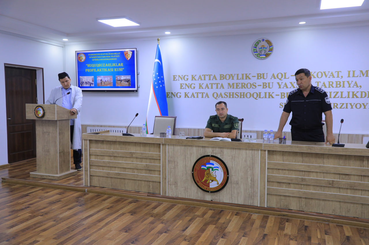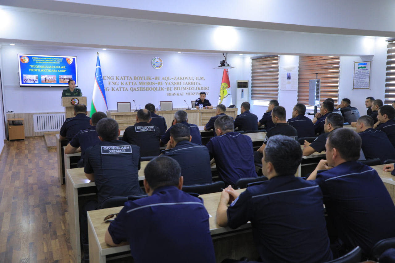 Shaxsiy tarkib oʻrtasida xizmat intizomi va qonunchilikni mustahkamlash, qonun buzilishi holatlariga nisbatan murosasiz munosabatda boʻlish muhitini yaratish, turli xildagi koʻngilsiz holatlar sodir etilishining oldini olish borasidagi ishlar hamda Huquqbuzarliklar profilaktikasi kuni doirasida Milliy gvardiya Fargʻona viloyati "Qoʻriqlash" boshqarmasida xizmat qilayotgan shaxsiy tarkibi ishtirokida profilaktik tadbir tashkil etildi.