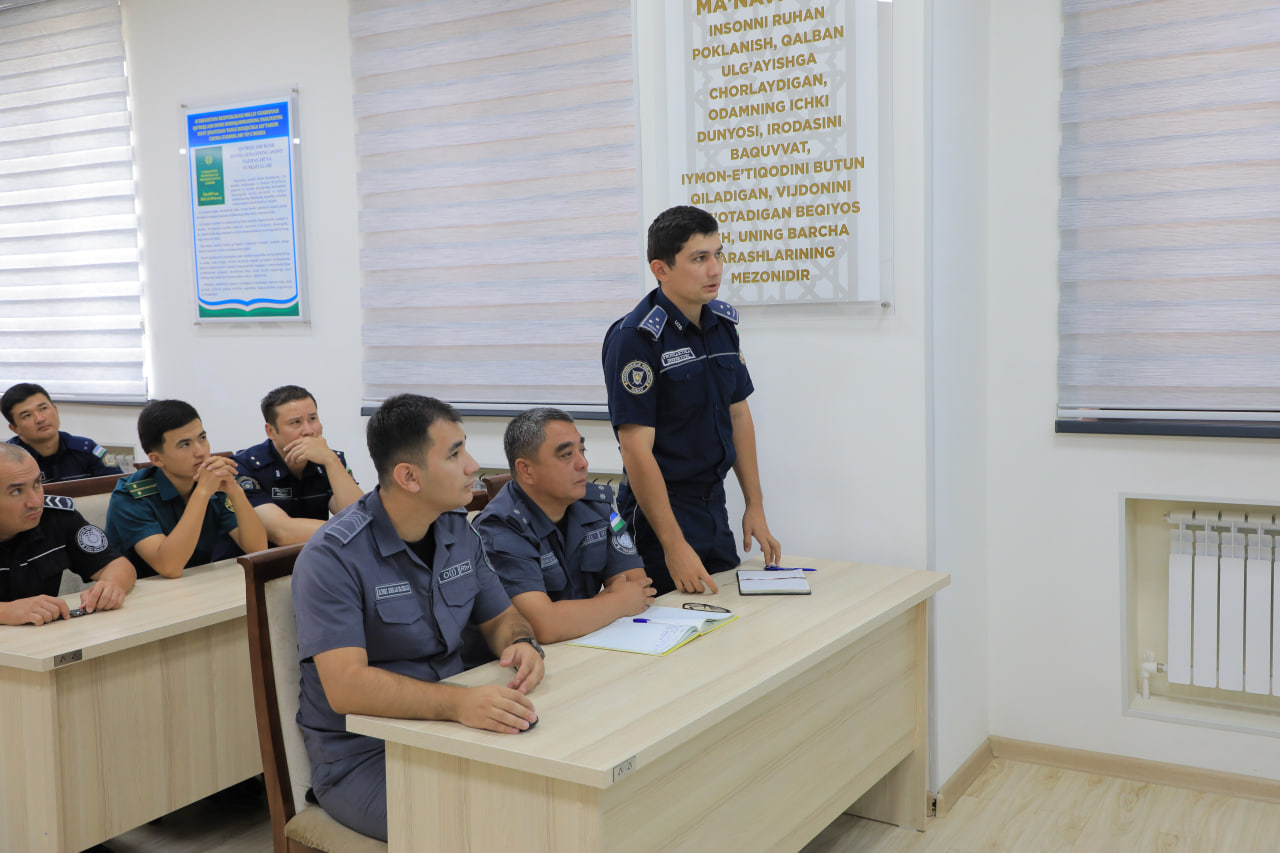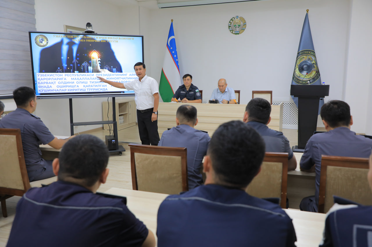 Mazkur tadbirda Oʻzbekiston Respublikasi IIV Malaka oshirish instituti Maxsus-kasbiy fanlar kafedrasi professori, polkovnik Z.Umarov va kafedra dotsenti podpolkovnik J.Kenjayevlar ishtirok etishdi. Soʻzga chiqqanlar hujjatning asosiy qoidalarini batafsil tahlil qilib, yangiliklar va ularning amaliy ahamiyatiga eʼtibor qaratdilar. Jinoyatchilikning barvaqt oldini olish boʻyicha mahalla tizimini takomillashtirish va belgilangan vazifalarni amalga oshirish mexanizmlariga alohida eʼtibor qaratildi. Bundan tashqari, tinglovchilarga hujjatning kompleks tahlili taqdim etildi, mavjud tizimni modernizatsiya qilishning asosiy yoʻnalishlari va huquqni muhofaza qilish organlari xodimlari oldida turgan ustuvor vazifalar yoritildi.