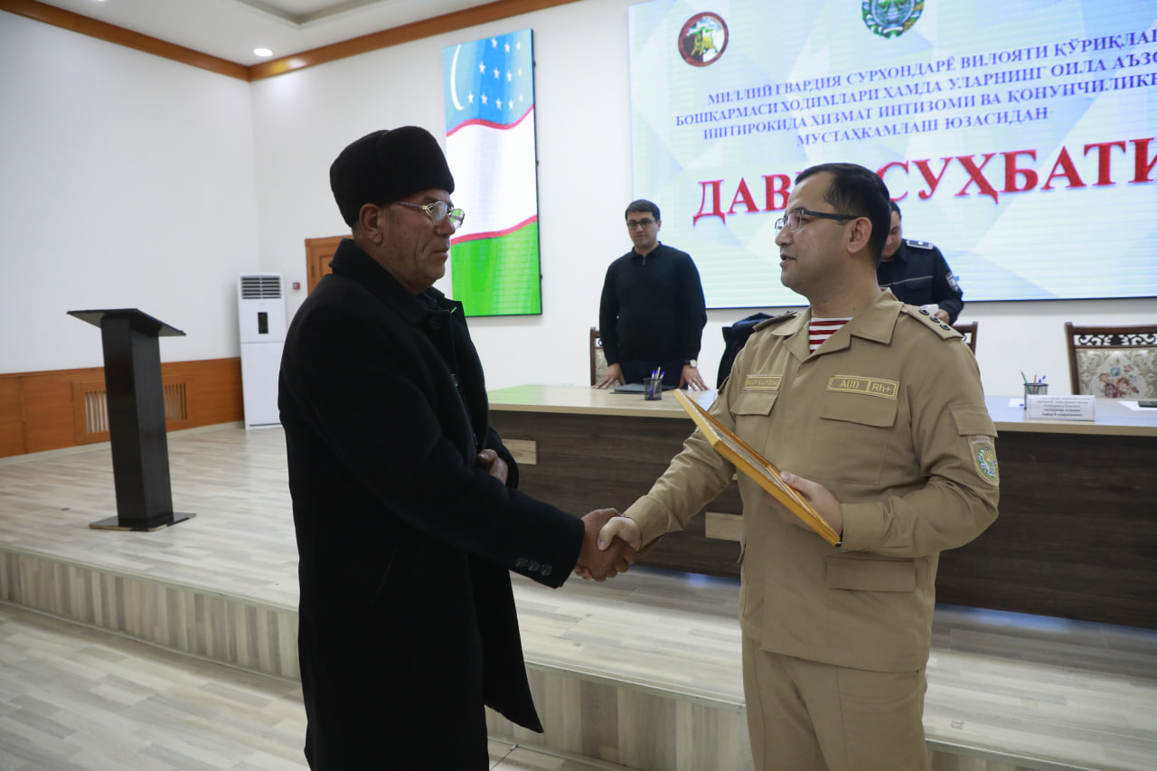 На днях с участием ответственных сотрудников Национальной гвардии и Термезской военной прокуратуры состоялась встреча с сотрудниками Управления «Охраны» Сурхандарьинской области и их семьями.