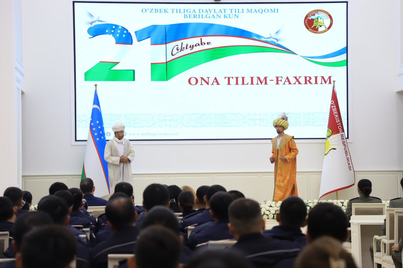 Тадбир аввалида сўзга чиққанлар томонидан истиқлол йилларида мамлакатимизда барча соҳаларда бўлгани каби тилимиз тараққиётида ҳам муҳим ўзгаришлар юз бергани, ўзбек тилининг халқаро миқёсда обрўси ошгани, шунингдек, Миллий гвардия фаолияти билан боғлиқ кўплаб ҳуқуқий-меъёрий ҳужжатлар лотин алифбосида юритилаётгани, ўзбек тили ривожи ва унинг Ватан тараққиёти учун улкан аҳамиятга эга эканлиги, тилимиз нуфузини янада мустаҳкамлаш ҳар биримизнинг бурчимиз эканлиги таъкидланди.