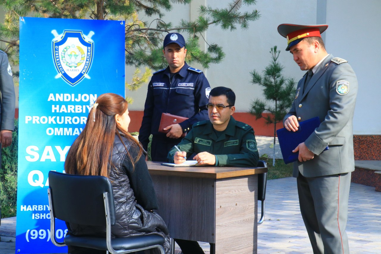 Шу билан биргаликда ҳарбий хизматчи ва ходимларнинг оила аъзоларини ҳуқуқий ва ижтимоий манфаатларини ҳимоя қилиш, уларни муаммоли вазиятларда қонуний йўл билан ҳал этиш юзасидан Андижон ҳарбий прокуратураси мутасадди ходимлари сайёр қабул ўтказилиб, келиб тушган мурожаатлар юзасидан ҳуқуқий маслаҳатлар берилди.