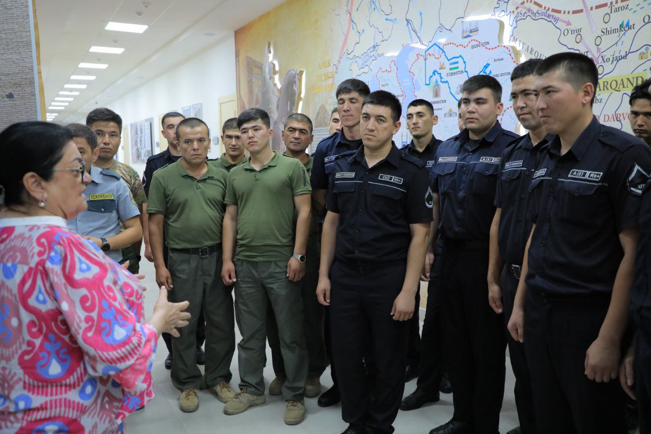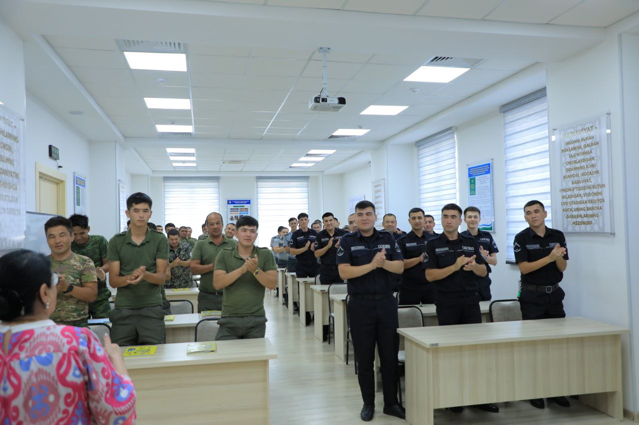 “Меҳнат шуҳрати” ордени соҳибаси, фалсафа фанлари доктори Шермуҳаммедова Жамила Тошпулотовна ўз ҳаётий тажрибасидан келиб чиқиб ёш тинчлик посбонларига сермашаққат хизматларида дуч келиши мумкин бўлган турли машаққатларни осон енгиш усуллари, хизматда учрайдиган салбий ҳолатларни босиқлик билан ҳал этиш, фуқаролар билан муомала маданиятини кучайтириш ҳамда уларга сўз орқали таъсир ўтказиш, низоли вазиятларда келишувга эришиш йўллари ҳақида ҳам асосли фикрлар билдирди.