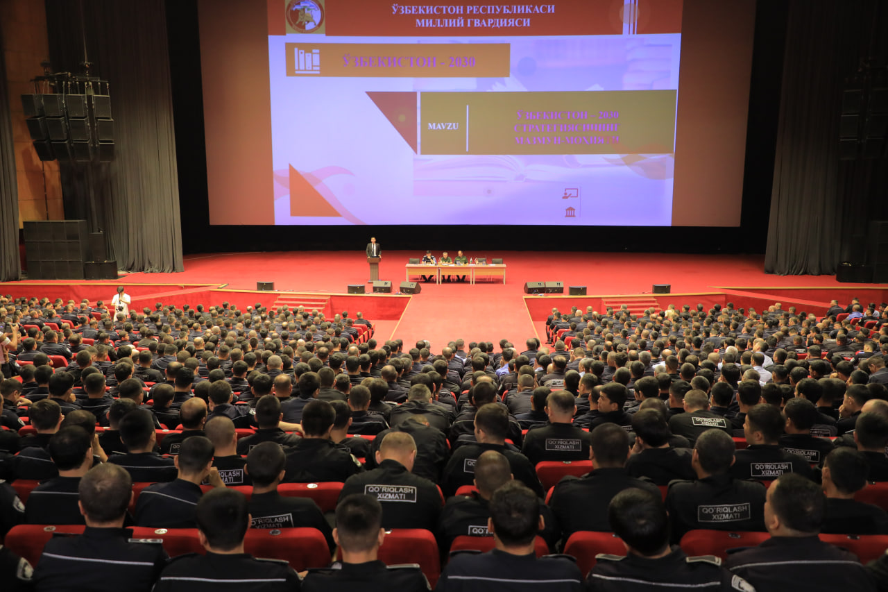 Дастлаб "Қўриқлаш" бош бошқармаси раҳбарияти томонидан "Ўзбекистон – 2030" стратегияси жамиятимиз тараққиётининг муҳим йўналишлари ҳисобланган бешта устувор йўналишларига асосланган юзта мақсаднинг асосий жиҳатларига тўхталиб ўтилди. "Хавфсиз ва тинчликсевар давлат" тамойилига асосланган сиёсатни изчил давом эттириш" йўналишидаги 11 та мақсад батафсил тушунтириб берилди.