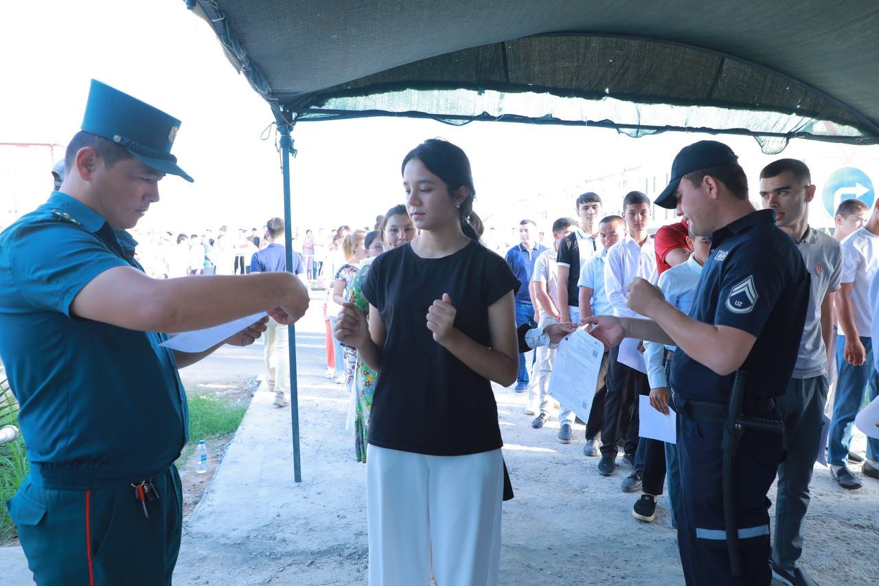 Миллий гвардия ҳарбий хизматчилари, "Қўриқлаш" бошқармаси ходимлари ҳамда вилоят ИИБ ходимлари томонидан имтиҳон вақтида ҳудуд хавфсизлиги ва жамоат тартибини сақлаш, шаффофликни таъминлаш ҳамда қонун талаблари бузилишини олдини олиш борасидаги чора-тадбирларга алоҳида эътибор қаратилмоқда.