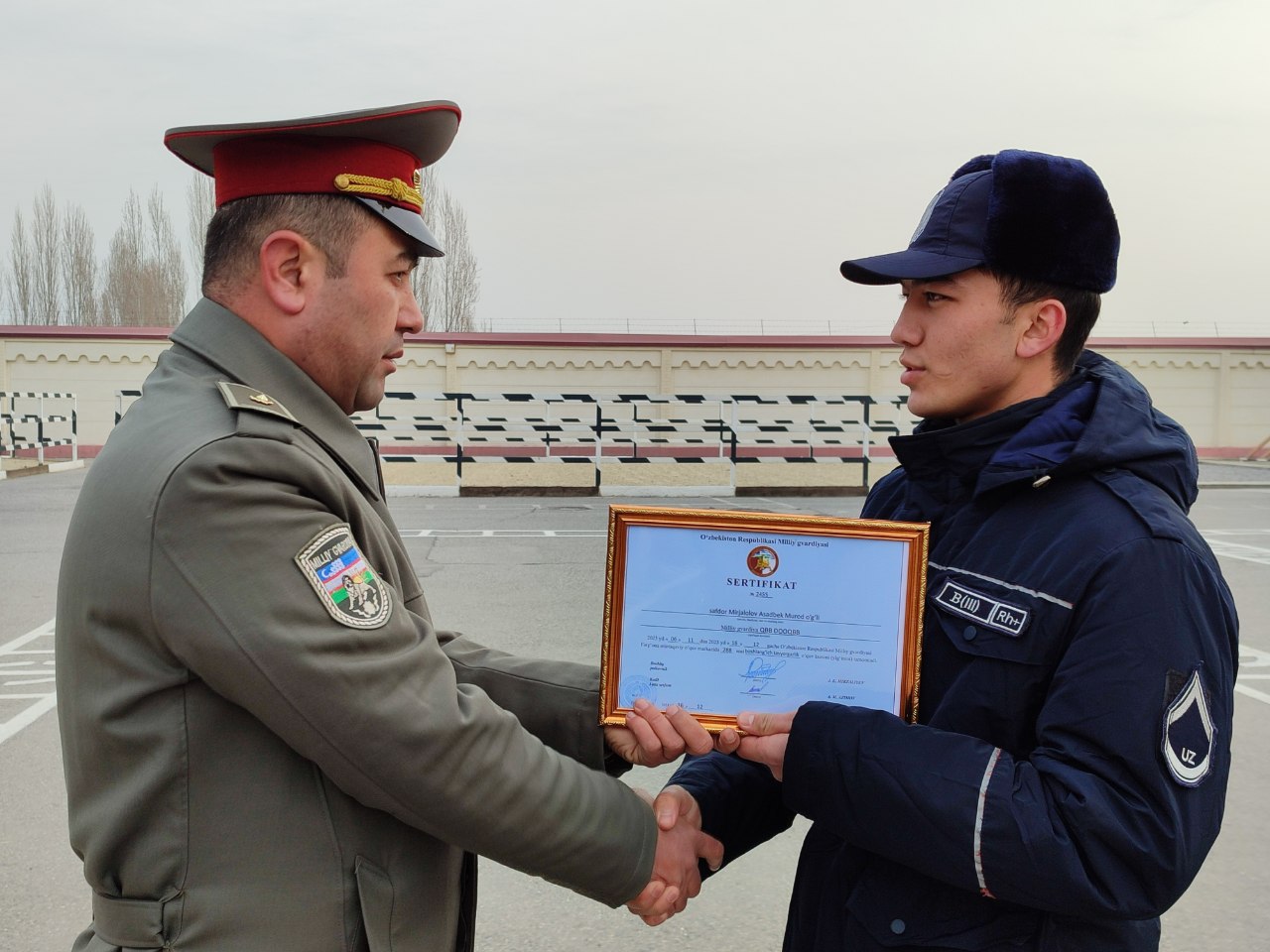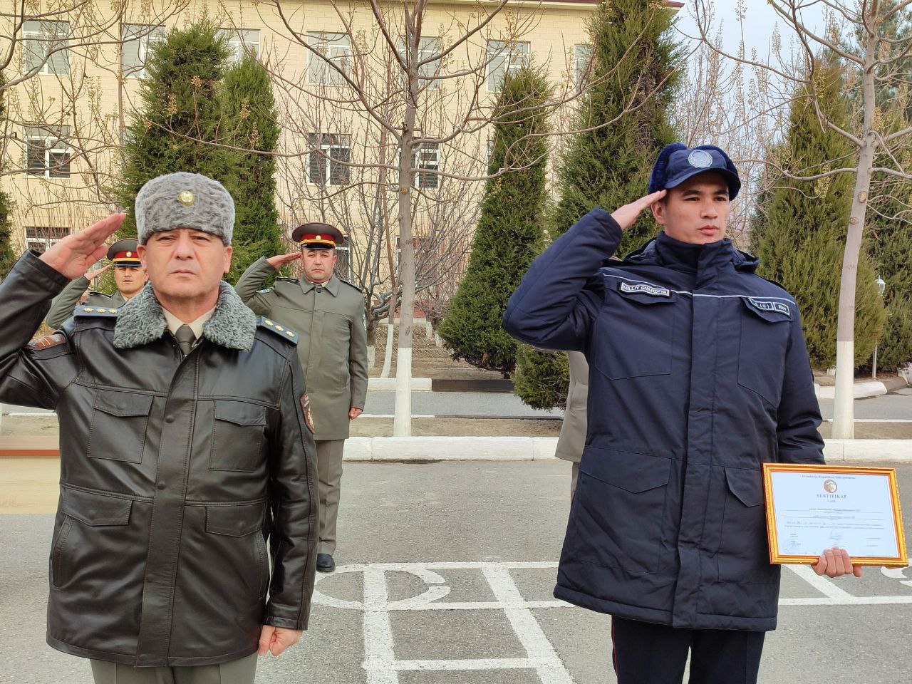 Куни кеча ўқув йиғинини муваффақиятли тамомлаган тингловчиларга тантанали равишда сертификатлар топшириш маросими бўлиб ўтди. Ушбу тадбирни Миллий гвардия Фарғона минтақавий ўқув маркази бошлиғи полковник Ж.Мирзалиев кириш сўзи билан очиб, тингловчиларни ўқув йиғинини муваффақиятли якунлаганликлари билан табриклаб, уларга сиҳат-саломатлик, тинчлик-омонлик, халқимиз осойишталиги йўлида олиб бораётган шарафли ишларида улкан зафарлар тилади. Ўқув йиғини давомида ўзининг намунали хулқи, тартиб интизоми билан сафдошларига ўрнак бўлган, аъло баҳоларга ўқиган, спорт мусобақасида яхши натижага эришган тингловчилар марказ бошлиғининг буйруғи билан фахрий ёрлиқ ҳамда ташаккурномалар билан тақдирландилар.