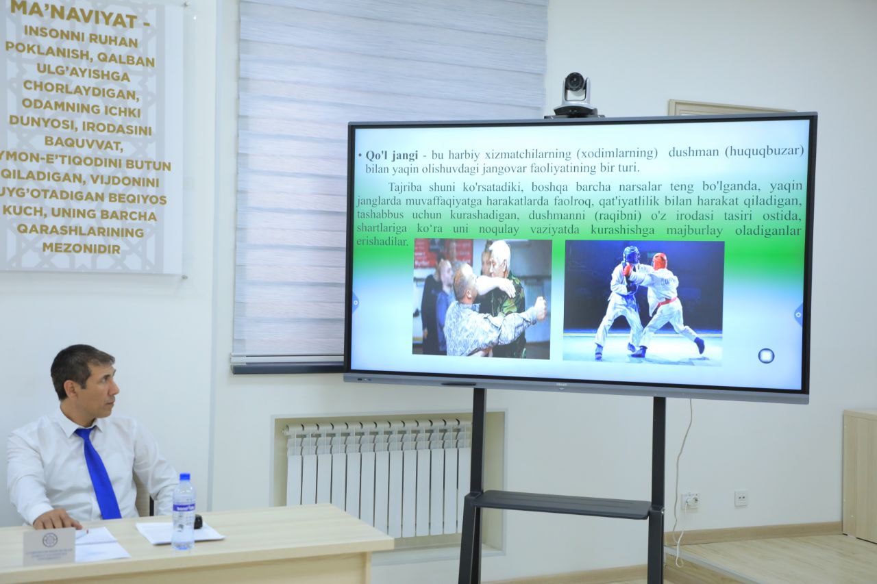 Қўл жанги ва бошқа спорт турларидан фойдаланган ҳолда турли ҳуқуқни муҳофаза қилувчи органлардан жам бўлган ходимларнинг амалий кўникмалари оширилиб, жиноятчини ва тартиббузарни ушлаш, шунингдек, ўзига бўладиган ҳужумлардан ҳимоя усуллари, инсон организмига зарар етказадиган аниқ нуқталар ҳақида маълумотлар берилди.