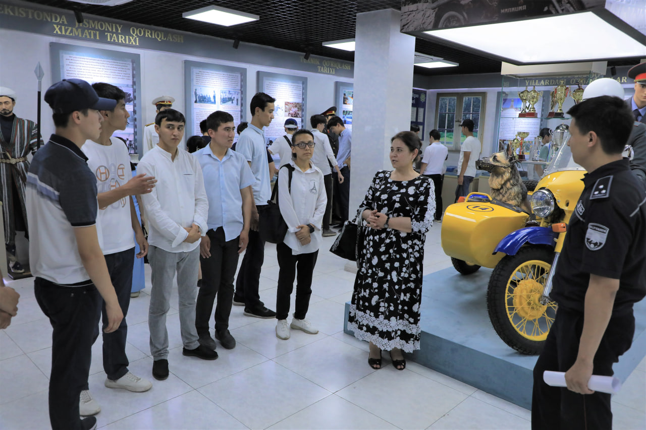 Талабалар дастлаб узоқ йиллик "Қўриқлаш" хизматининг ривожланиш тарихи, соҳага оид экспонатлар ҳамда кўргазмали буюмлар билан яқиндан танишдилар.