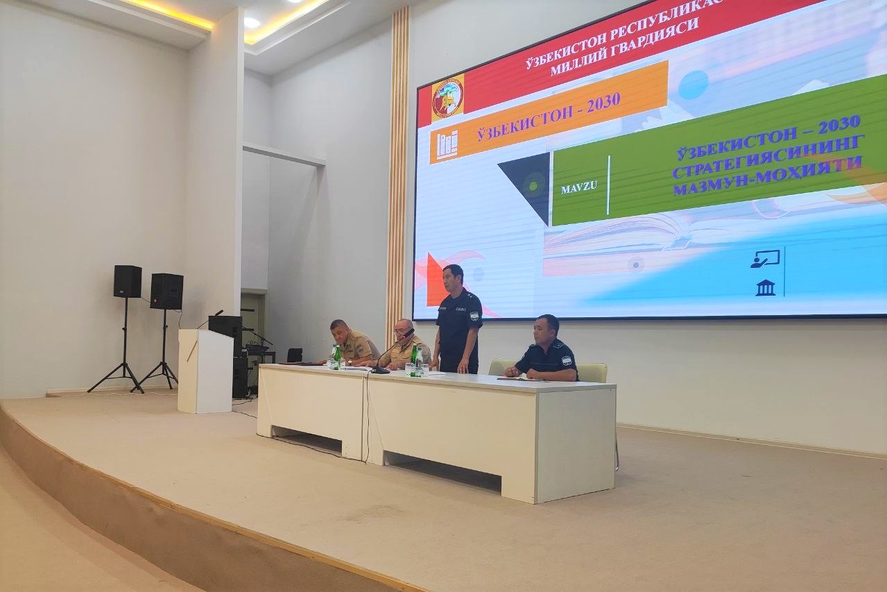 Мазкур машғулотларда бугунги кунда қонунчиликдаги янгиликлар, Миллий гвардия ҳарбий хизматчи ва ходимлари учун белгиланган талаблар хусусида, шу билан бирга давлатимиз раҳбари томонидан илгари сурилган "Ўзбекистон – 2030" стратегиясида белгиланган вазифалар ҳамда уларнинг амалий ижросига қаратилган чора-тадбирлар бўйича маълумотлар етказилмоқда.