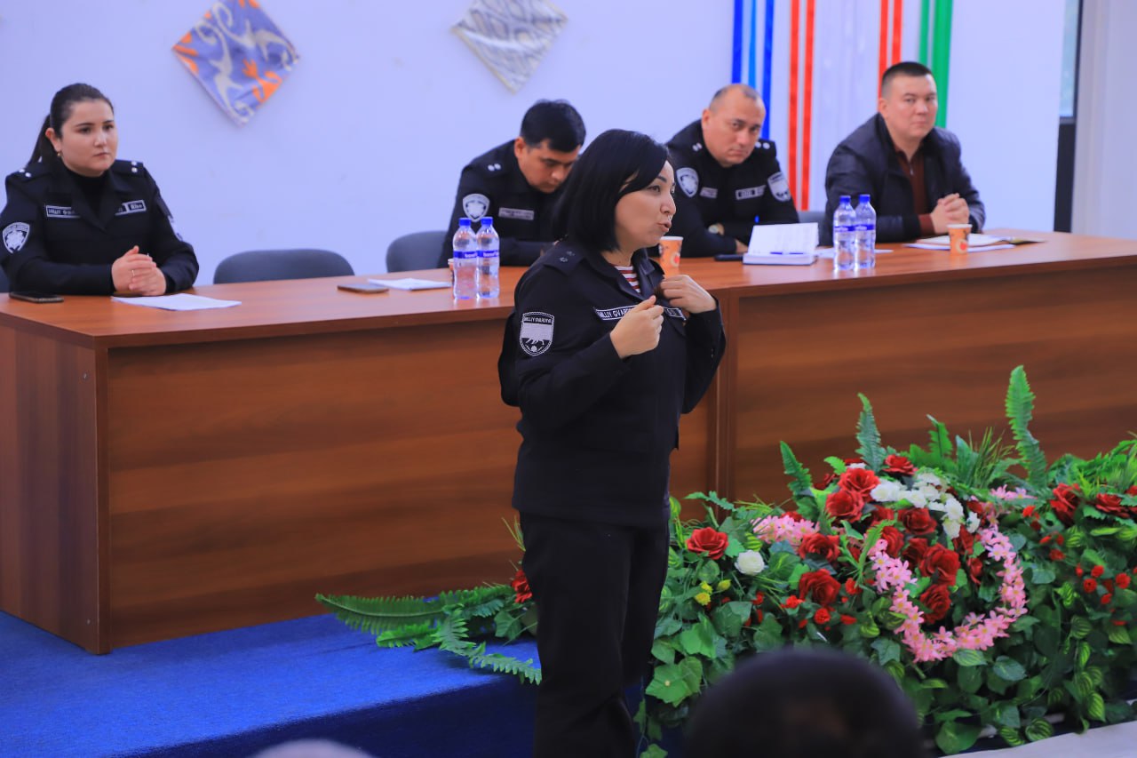 Тадбирда "Қўриқлаш" бош бошқармаси бошлиғи ўринбосари подполковник Б.С.Жумаев ҳамда хотин қизлар қўмитаси раиси подполковник Б.С.Ашурматова томонидан ҳуқуқбузарликларга қарши курашиш, коррупцион ҳолатларнинг олдини олиш ҳамда виртуал оламда авж олаётган таваккалчиликка асосланган турли ўйинларнинг аянчли якуни ҳақидаги долзарб мавзулар борасида сўз борди. Шахсий таркиб орасидаги муаммоларни ўрганиш, уларни эрта аниқлаш ҳамда бартараф этиш мақсадида масъулларга зарурий кўрсатмалар ҳам берилди.